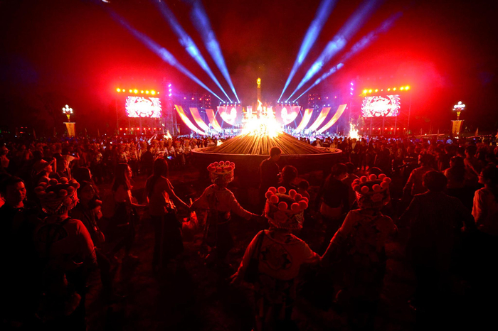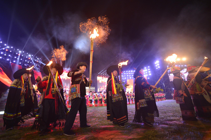火把欢歌不夜天,彝州儿女舞翩跹。7月17日晚,楚雄市太阳历文化园火把广场,人如潮歌如海。灯光、火光、高空礼花映照夜空,歌声、乐声、欢呼声响彻鹿城,中国·楚雄2017彝族火把节主会场祭火大典在这里隆重举行。