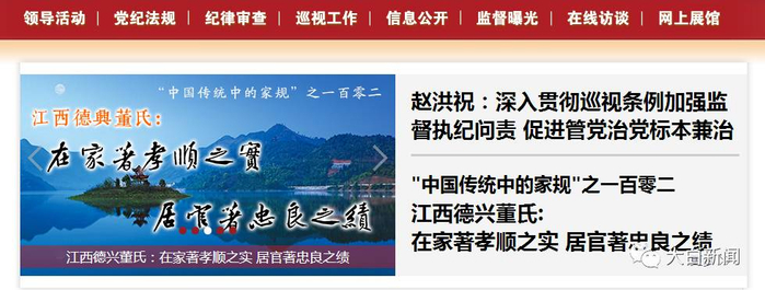 今日,大白新闻(微信ID:dabaixinwen)从中央纪委官网注意到,今天的中央纪委官网首页出现了《“中国传统中的家规”之一百零二 江西德兴董氏:在家著孝顺之实 居官著忠良之绩》的消息。