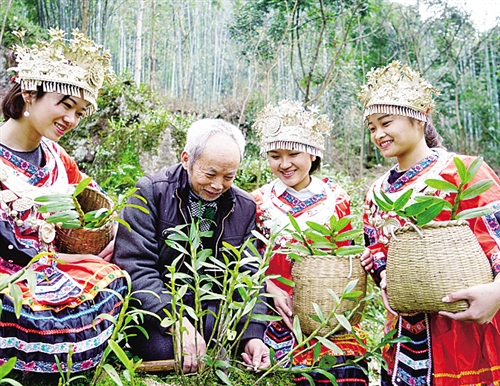 赤水石斛种植在旅游业的带动下快速发展。图为赤水鸭岭村老支书王朝贵(左二)在教授苗族姑娘石斛种植技术。