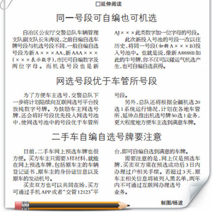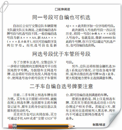 全疆网选车牌的自编自选通道打开,意味着全疆车主都可以到网络平台上预选心仪的自选号牌。目前,首府车主仍然可以选择到车管所办理或者在互联网办理。