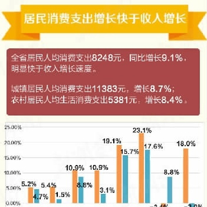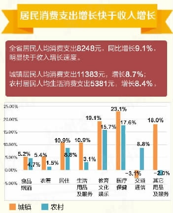 [数据] 上半年全省居民人均消费支出8248元,同比增长9.1%。其中,城镇居民人均消费支出11383元,增长8.7%;农村居民人均生活消费支出5381元,增长8.4%。