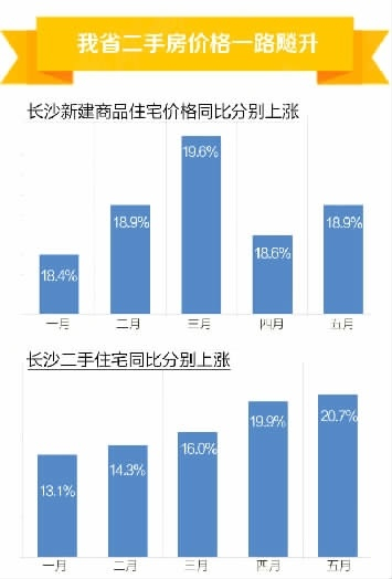 [数据] 我省参与国家房价调查的有长沙、岳阳和常德三个城市。据国家统计局反馈, 1至5月,长沙新建商品住宅价格各月涨幅均保持18%以上,二手住宅价格涨幅逐月提高;岳阳和常德商品住宅价格稳步上涨。
