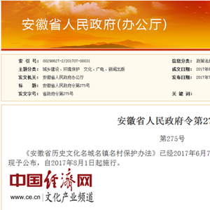 以下为《安徽省人民政府令第275号》及《安徽省历史文化名城名镇名村保护办法》全文。
