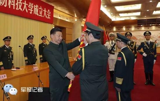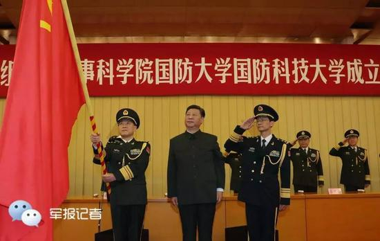 上午9时30分,成立大会开始,全场高唱国歌。习近平将军旗郑重授予军事科学院院长杨学军、政治委员方向,国防大学校长郑和、政治委员吴杰明,国防科技大学校长邓小刚、政治委员刘念光,他们从习近平手中接过军旗。全场官兵向军旗敬礼。