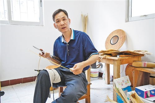 甘坑小镇凉帽手工艺人张裕光向记者现场展示凉帽制作工艺。