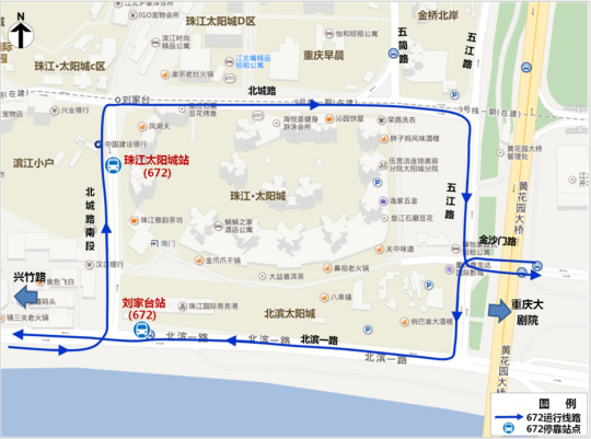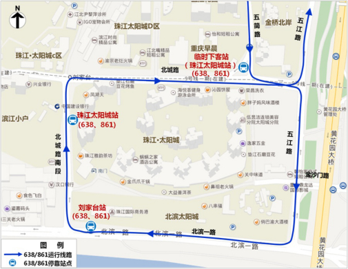 站点调整:往大剧院方向原珠江太阳城站迁至北城路南段停靠,反向站点不变。