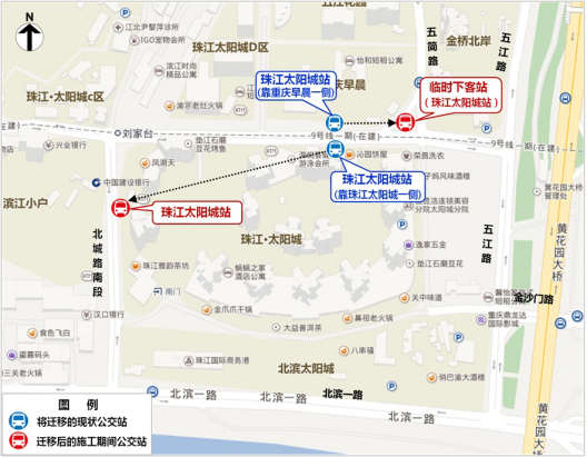 原珠江太阳城站(靠重庆早晨一侧)迁至五简路临时下客站,原珠江太阳城站(靠珠江太阳城一侧)迁至北城路南段。
