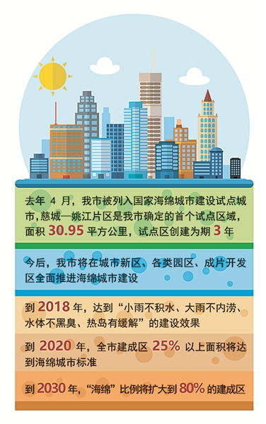 2016年4月,我市被列入国家海绵城市建设试点城市,慈城—姚江片区是我市确定的首个试点区域,面积30.95平方公里。试点区创建为期3年。经过一年多时间的建设,试点区水涝治理初见成效。9个政府投资的在建项目完成海绵化改造。