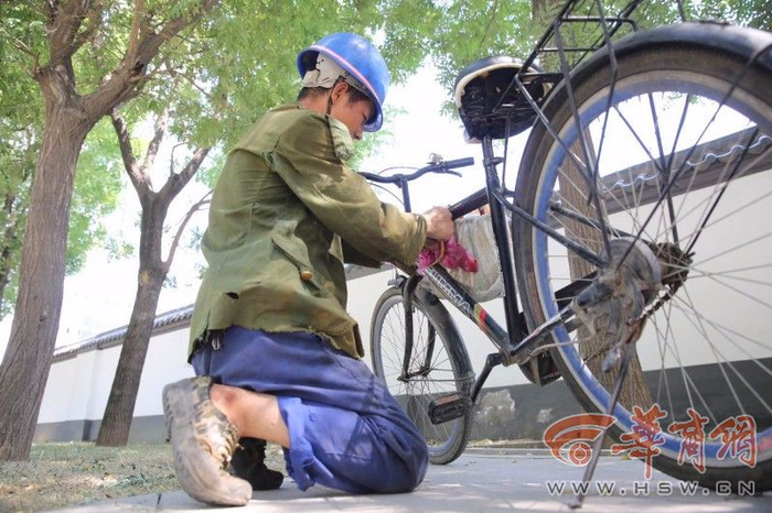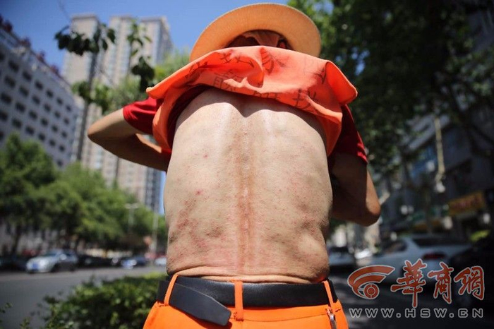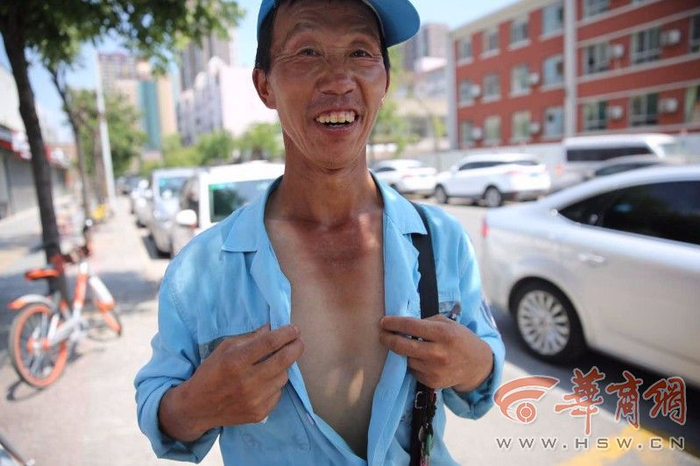 14:45,在西影路中段,保洁员张师傅也同样坚守在岗位上。可能因为太热,他把衣襟撩起来的时候,记者看到他身上长满了痱子。带着草帽,他同时又用一块湿毛巾顶在头上降温吸汗。他说自己54岁了,租住在王家村,因为天气太热晚上干脆睡地板,但感觉还是热,就用水泼一下再睡才能感觉凉快点。而且房子上面的石棉瓦破损了,下雨天会漏水。他每天凌晨3时30分要到岗,一直工作到上午10时30分回去吃饭休息。然后,11时30分就要再次到岗,一直工作到17:30(早班)或者18:30分(晚班)。一个月工资是2450元,夏天会发一些高温补贴,冬天有一些取暖补助。至于降温费到底是多少钱,因为平时工资由孩子代领,他不是很清楚。
