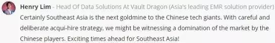 的确,在东南亚国家,中国企业这两年通过技术出海,一大批中国互联网模式复制过去,同时影响大批东南亚创业跟风而起。Herry Lim是新加坡一家数据处理企业的负责人,他在网上预言:对于中国科技巨头来讲,东南亚无疑是下一个金矿。东南亚面临着激动人心的时刻!
