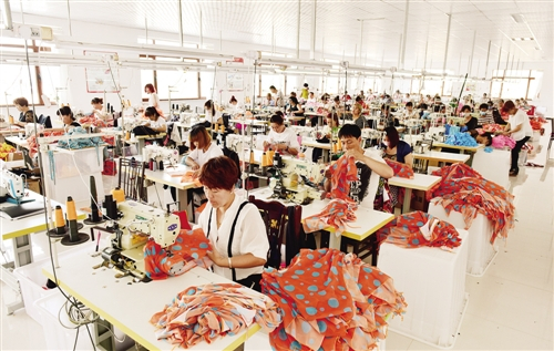 碱厂乡碱厂村泳装厂的车间内,工人们正在工作。李吉明摄