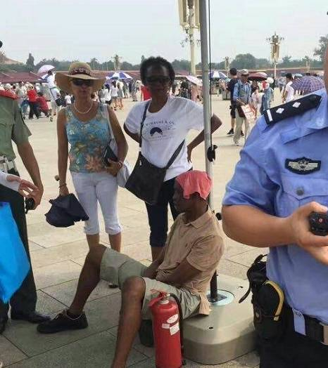 7月13日,一位非洲友人在天安门广场中暑。执勤哨兵安排中暑游客在岗伞内休息,随后拨打急救电话,救护车把中暑游客送往医院治疗;
