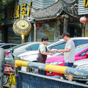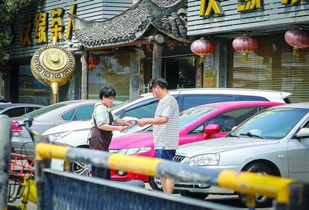 某商铺员工向车主收取停车费 /晨报记者 张佳琪