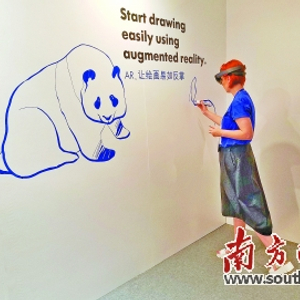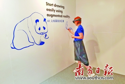 大会期间,来自立陶宛的企业SketchAR为大家带来了通过AR技术进行绘画的应用。使用者戴上AR的头显眼镜,就能够看到需要绘制的图像。在白色的墙面上,只要用笔照着眼镜中投射的线条进行描绘,就能够画出效果出众的素描。