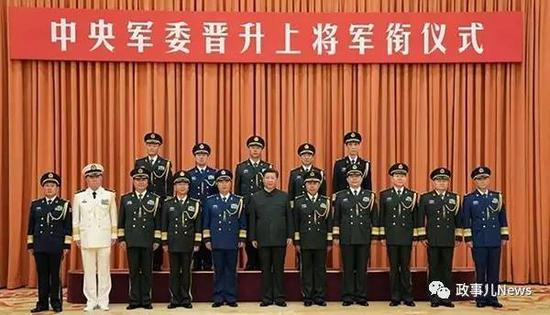 这次晋升上将军衔的军官是:中部战区司令员韩卫国、陆军政治委员刘雷、空军政治委员于忠福、火箭军政治委员王家胜、战略支援部队司令员高津。