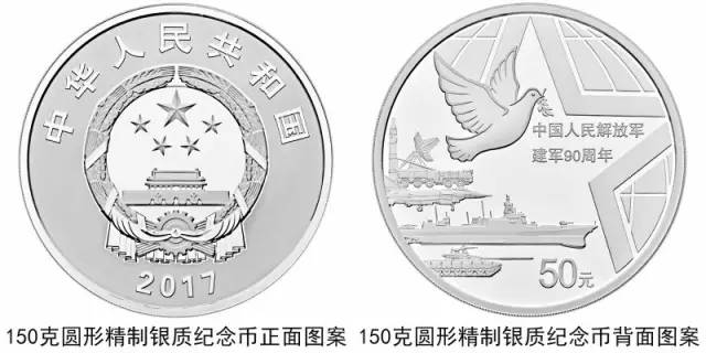 150克圆形银质纪念币背面图案为陆军、海军、空军、火箭军、战略支援部队典型武器装备以及地球、和平鸽图形等组合设计,并刊“中国人民解放军建军90周年”字样及面额。