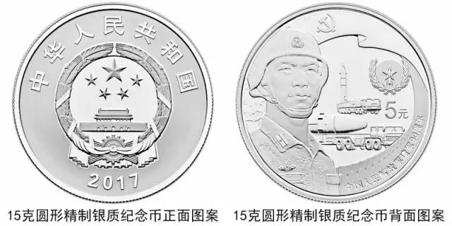 15克圆形银质纪念币背面图案之四为党旗下的火箭军军人形象配以典型武器装备、军兵种臂章图案、长城造型等组合设计,并刊“中国人民解放军建军90周年”字样及面额。