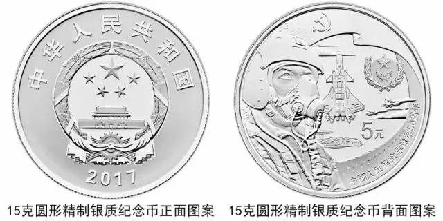 15克圆形银质纪念币背面图案之三为党旗下的空军军人形象配以典型武器装备、军兵种臂章图案、长城造型等组合设计,并刊“中国人民解放军建军90周年”字样及面额。
