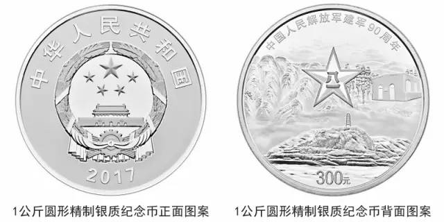 1公斤圆形银质纪念币背面图案为八一军徽配以井冈山、延安宝塔山、西柏坡典型造型组合设计,并刊“中国人民解放军建军90周年”字样及面额。