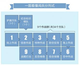 参加分列式的共有36个方队梯队,由1个护旗方队、1个纪念标识梯队和9个作战群的34个方队组成。作战群包括:陆上作战群、信息作战群、特种作战群、防空反导作战群、海上作战群、空中作战群、综合保障群、反恐作战群和战略打击群。“这些作战群囊括陆海空天网电全维领域,既有战术武器,也有战略武器,突出实战,展示了实战能力。”军事专家韩东表示。