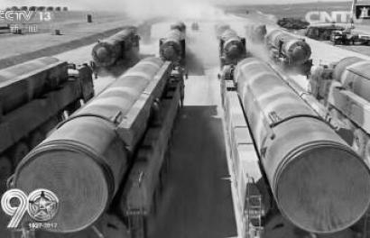 由火箭军1个部队方队和4个导弹方队、5型导弹组成的战略打击群,以“压轴”方式光荣地接受检阅。