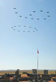 在分列式上,第二个亮相的纪念标识梯队引人注目。由17架直-19直升机编成的“八一”标识,由24架直-10和直-19直升机混合编成的“90”字样,以低空飞过的方式,完美通过检阅台。