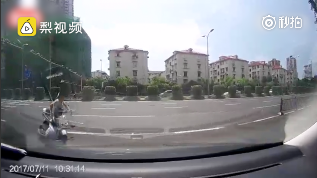 从车主张先生发布在微博上的行车记录仪视频中,记者看到,7月11日上午10时30分,张先生驾车从四平路中天大厦停车场出来。10时31分08秒,车开到停车场出口处,闸机栏杆升起,此时前方人行道上有两名行人经过,张先生减速刹车。10时31分14秒,轿车起步,即将行驶到非机动车道,此时,左前侧一辆白色电动车行驶过来,轿车刹车停下。没想到,在没有碰撞的情况下,电动车瞬间翻倒在地,女骑手向前摔倒在地,电动车后座的男孩则背后着地,但两人都迅速自己站了起来。