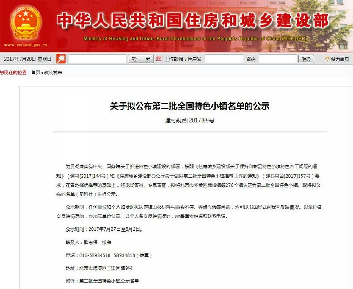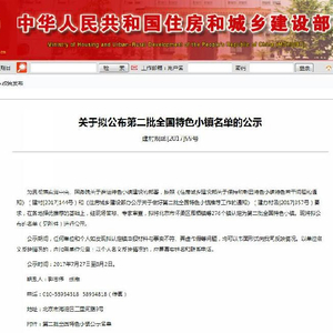 据了解,为贯彻落实党中央、国务院关于推进特色小镇建设的部署,按照《住房城乡建设部关于保持和彰显特色小镇特色若干问题的通知》和《住房城乡建设部办公厅关于做好第二批全国特色小镇推荐工作的通知》要求,在各地择优推荐的基础上,经现场答辩、专家审查,拟将北京市怀柔区雁栖镇等276个镇认定为第二批全国特色小镇。