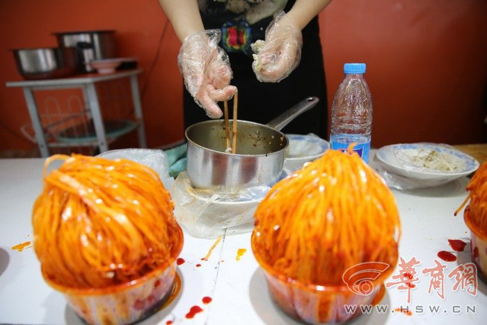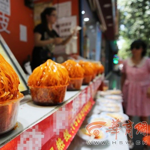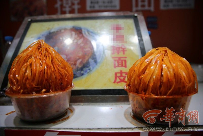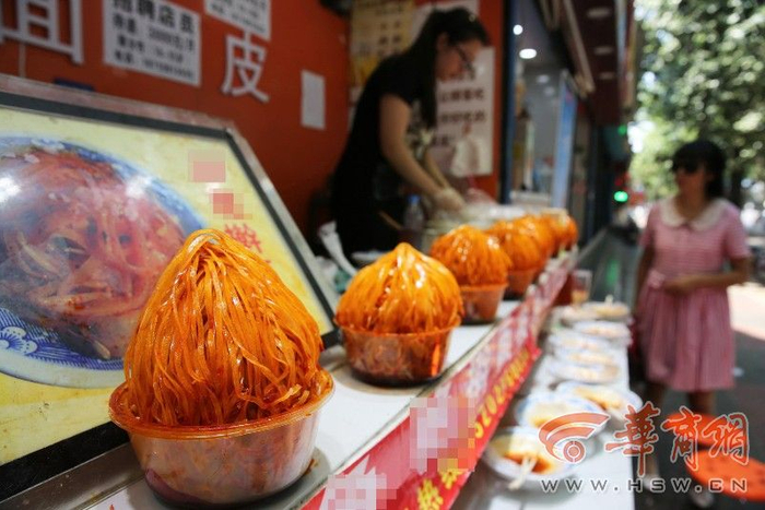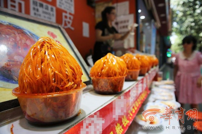 在西安市太白路上,一家卖擀面皮的小店,将碗中的擀面皮做成甜筒冰激凌形状,再浇上红色的辣椒油,感觉还是很诱人。这家小店只卖擀面皮,一张面皮切开后盛一碗。面皮切好后调上料汁,重点是辣椒油。据服务员介绍,这些甜筒冰激凌形状的擀面皮是普通面皮风干后做出的造型。吃的面皮是软的,堆不起来。甜筒形状的擀面皮颜色非常诱人,吸引了不少顾客前来购买品尝。擀面皮是陕西特色传统名小吃,在西安的大街小巷都可以找到面皮店,尤其是夏天,凉皮、擀面皮成为大家最喜爱的小吃。