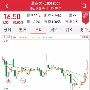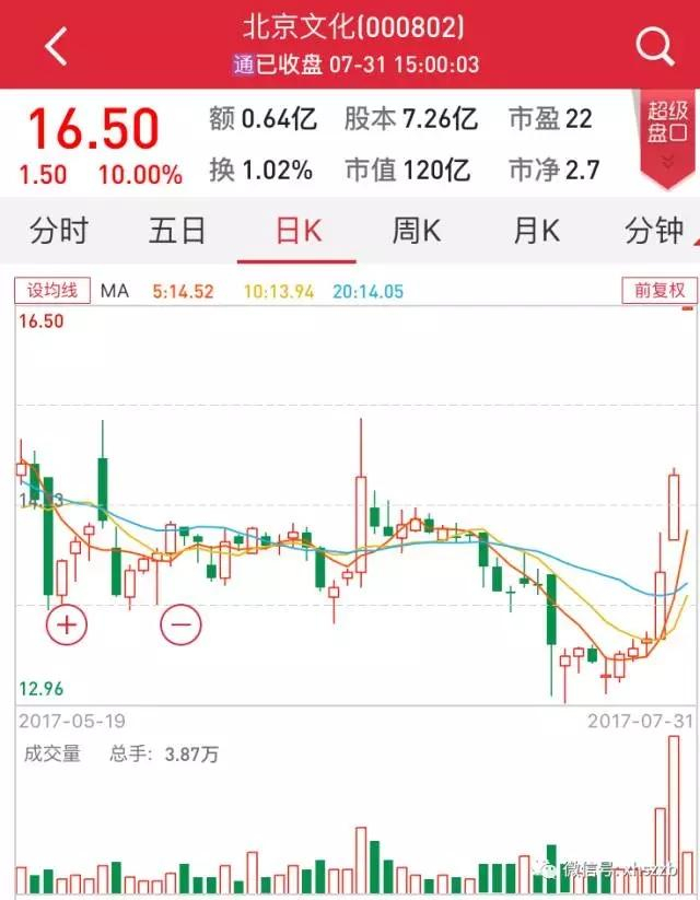 7月31日,北京文化一字涨停,报收16.5元/股。当日,公司投资并参与保底的影片《战狼2》累计票房突破11亿。
