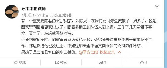 孙木木的微博截图。 云阳县公安局供图 华龙网发7月初,云阳县公安局官方微博@平安云阳收到了一位网名叫“孙木木”的网友私信。信中称一名19岁少年在他们公司附近流浪了一周多,少年自称陈某,是云阳县水口镇人,希望云阳公安帮帮他。