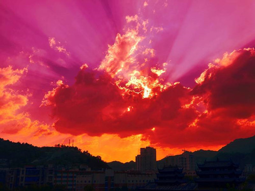 “火烧云”美景不停地变幻形态。通讯员 种统强 陶霞 供图近日,黔江城区上空日落时出现赤色云霞。通讯员 种统强 陶霞 供图