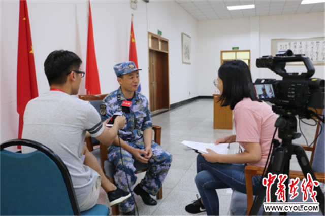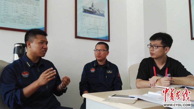 中国青年报·中青在线记者正在采访北海舰队舰载机航空兵某独立团指导员陈军(左一)和军械师罗德昌(左二)。韩玉/摄