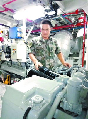 李金龙所在的艇是交通艇,保障任务多且重,一般情况下,即使艇不出航,他每天都要到机舱里作业两小时;出航时,他就要守在机舱里,艇航行多久,他就要守多久,最长一次出航,他在60℃高温的机舱里待了6小时,感觉人都被“蒸熟”了。
