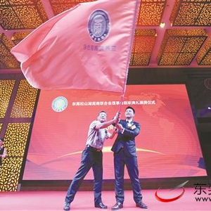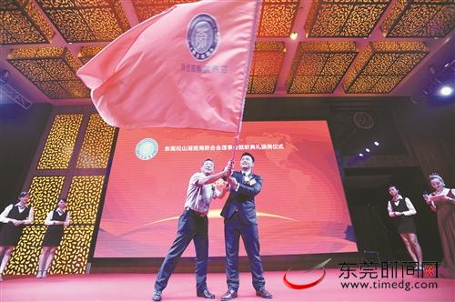 昨日,松山湖莞商联合会会员大会暨理事会就职典礼举行。图为世界莞商联合会会长尹洪卫向松山湖莞商联合会会长陈满新授旗(记者 郑志波 摄)