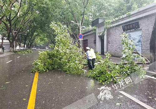 狂风暴雨刮倒渝中多路段大树 交巡警冒雨搬树疏导交通