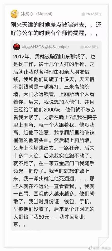 5月18日中午,“科蓝公司”通知李文星入职后,他曾在QQ上将此事告诉了高中同学王某。“他们说(让我)在天津待一个月,怎么都感觉像是传销”,李文星告诉同学,“科蓝公司”在BOSS直聘的账号也被冻结,他有疑虑。