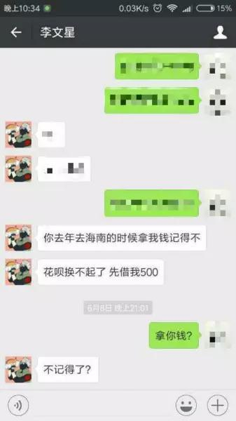 6月8日,李文星又一次向胡某提出借款500元的请求,“他还说我之前去海南的时候欠了他1000元,但是我从没有跟他借过钱。”