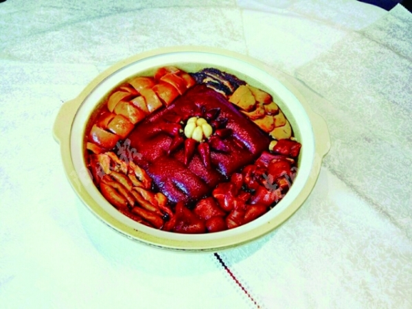 烹调方法:炸、炖、焖。味型:香辣。菜品特点:软糯,色泽红亮,油而不腻。