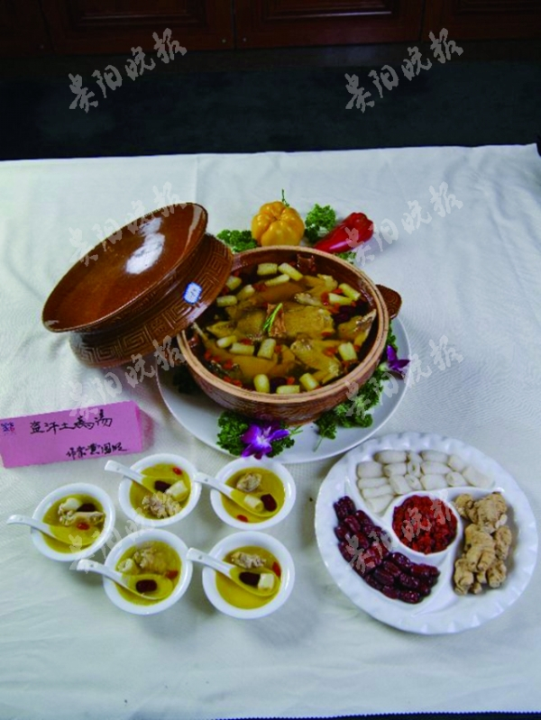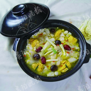 2.取一盗汗锅,将鸡块、红枣、枸杞、野生虫草、石阡苔茶放入盗汗锅内,注入石阡矿泉水,加姜片,葱节,放入水锅中炖四小时,调入盐味,少许胡椒粉、白糖、滴入几滴石阡野生山茶油即可上席。