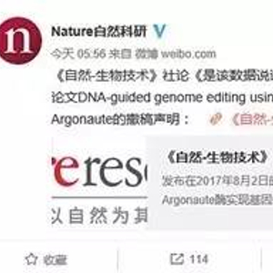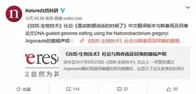 ▲昨日,自然出版集团官方微博发表《自然-生物技术》社论与韩春雨及同事的撤稿声明。