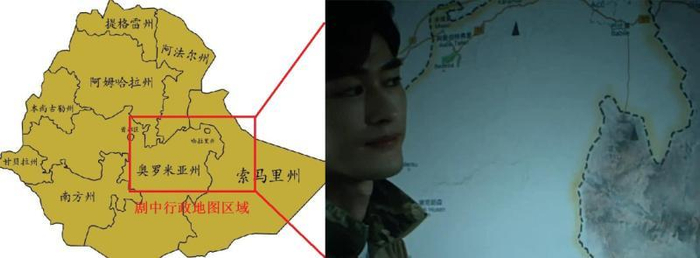 这个欧加登地区于19世纪末被埃塞俄比亚皇帝孟利尼克二世征服,1970年代后期,埃塞俄比亚和索马利亚两国还为争夺此地区而进行了一场欧加登战争,看来剧组用的也是历史地图了——尤其是地图上厄立特里亚还没有独立,铁定是1993年之前的地图了。只是,吉布提和索马里被划成同样的颜色,也实在让人太难“破解”了吧……