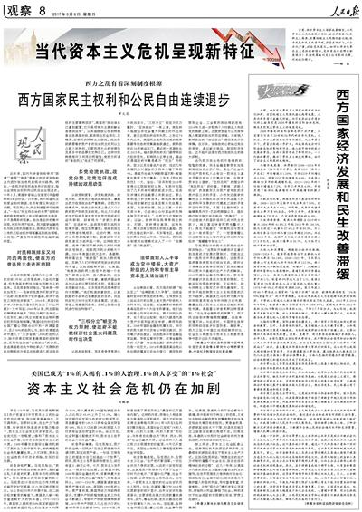 当前,西方资本主义国家乱象频发,当代资本主义危机呈现新特征:政治矛盾激化,民粹主义高涨,右翼极端主义思潮沉渣泛起,经济发展和民生改善滞缓,贫富差距扩大,社会分化严重,社会危机恶化。如何看待当代资本主义危机的新特征,危机背后存在哪些制度根源?本期观察版刊发3位专家的文章,对此进行探讨。