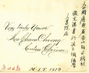 记者登录上述展览的网页看到,张文湛在1877年9月经由香港到达美国麻省理工学院,成为一名普通的留学生,学习机械专业,目的是希望能够掌握实用的专业知识报效祖国。1878的春季学期结束后,张文湛曾离开过学院一段时间,1879年到1882年张文湛又以特殊学生的身份回到麻省理工学院。