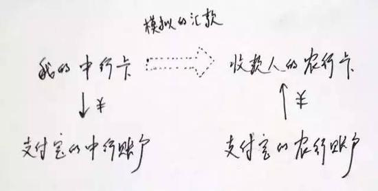 比如,我用支付宝做一次跨行转账,从中行向收款人(可以是自己)的农行汇款。那么,只要从我的中行卡转到支付宝开在中行的账户,然后支付宝再把它存在农 行的钱,汇至收款人的农行账户上。以此,支付宝用两笔同行转账,“模拟”了一次跨行汇款(下图虚线部分),用不着央行的清算账户。