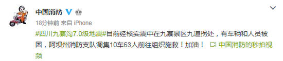 [阿坝州消防支队调集10车63人前往组织施救]目前经核实震中在九寨景区九道拐处,有车辆和人员被困,阿坝州消防支队调集10车63人前往组织施救!