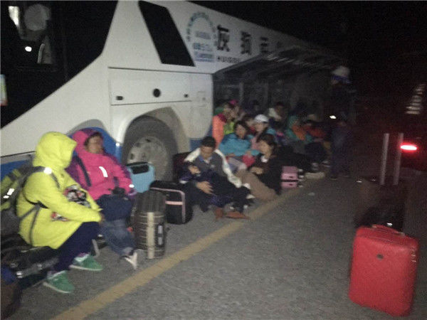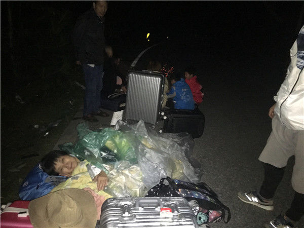 记者了解到,目前游客已经与外界取得了联系。夜晚的九寨沟温度较低,被困的游客相互依靠着取暖。