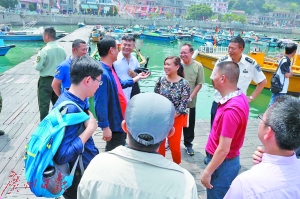 殷金好在渔船浮动码头前了解情况。