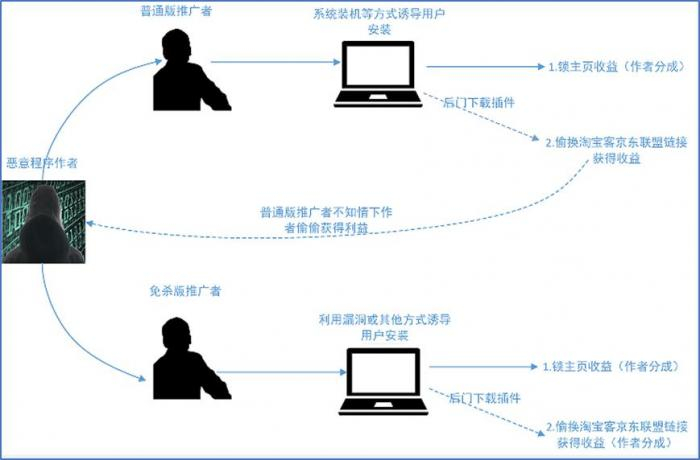 通过溯源分析,360摸清了“擒狼”的底细:无论是技术手段还是黑产盈利模式,“擒狼”和网上曾经活跃的“一生锁页”浏览器锁定工具都十分相似。木马除劫持浏览器外,还通过静默安装推广程序、劫持电商推广等行为实现流量变现。“擒狼”团伙持续开发木马程序,推广者利用挂马和系统装机等方式诱导中招者下载木马,赚取的佣金则被双方分赃。