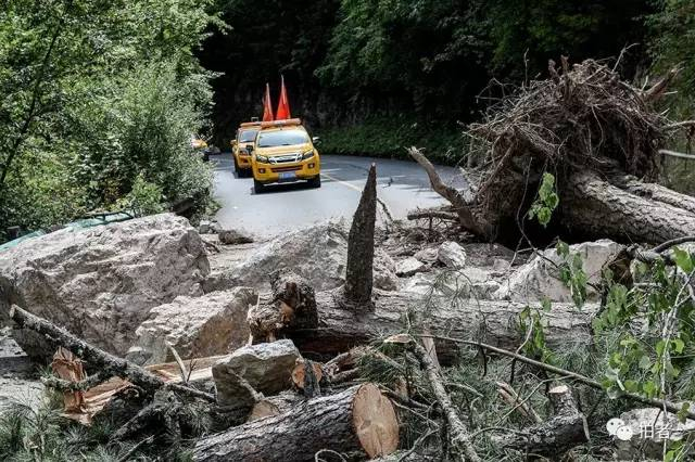 一棵大树因塌方从山上冲到路面上,一段道路被土石和树木阻塞……